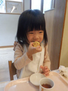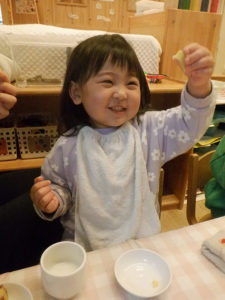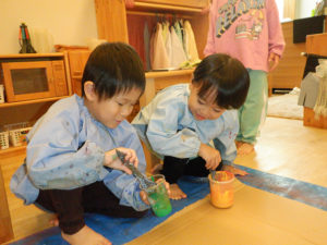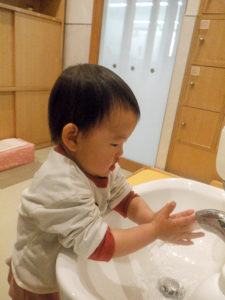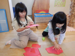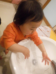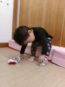 少しずつ身の回りの事に興味を示し、『やってみたい!』という気持ちが芽生え始めています。靴や衣服の着脱や手洗い等、今まで大人と一緒にしていた事を自分でしてみようとチャレンジする姿が沢山見られるようになりました。自分でしたいけれど、まだまだうまくいかず、困った表情を見せる事もありますが、そんな時は、子どもの表情を見て「ここを持ってみる?」と具体的に言葉を掛け、自分でできる方法を一緒に考えたり、温かく見守ったり、それぞれの思いに寄り添うよう事を心がけています。「できた、できない」だけではなく「やってみたい、やってみよう」という前向きな気持ちを大切に育くんでいきたいと思います。