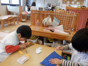 ハロウィンが終わると、「次はクリスマスだ!」と言って、クリスマス製作が始まりました。夏に折り紙で作ったセミやカブトムシなどが止まっていた木がクリスマスツリーに大変身。クリスマスツリーの飾りは、モールや折り紙だけで作ろうと考えていたお友だちでしたが、どんぐりや落ち葉も使って飾りを作ってみたいという思いが出てきました。散歩に行く計画を立てて、どんぐりや落ち葉などを沢山拾おうと思っています。他にも、「裁縫をやってみたい!」というお友だちが増えてきているので、裁縫でクリスマスツリーの飾りを作ってもいいかなと考えています。どんなクリスマスツリーが完成するのか楽しみです。