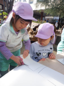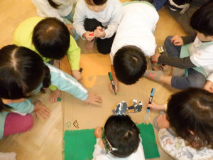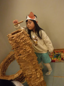 「やまぶきおうちつくりたい」という声からお世話コーナーとままごとコーナーを繋げてお家を再現しています。その中で「お家にあるもの」は何があるかサークルタイムで話し合い「屋根がなかったら濡れるよ」「ドアには鍵がある」「ペットも飼いたい」等などそれぞれの思いが溢れていました。作れそうな物、材料がある物から作り、徐々に必要な物が揃ってきました。構造コーナーでは橋と階段が完成したことからかもめさんが作っていたタワーを違うのにしたいという声が上がり、周りに作っている物が壊れないように慎重に片付けが始まり、どんなタワーにするか相談中です。これからどのように遊びが広がっていくのか楽しみです。