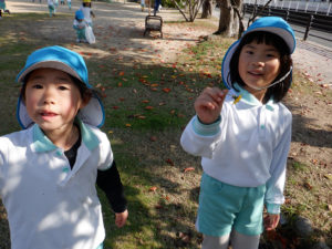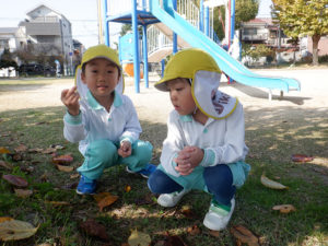 「どんぐりを拾いに行きたい」と秋の実りを収穫する為、園外計画をたてています。近隣の公園を順番にあそびにいく予定にしており展望公園、瑞穂公園に行きました。公園に着くと、開放的な空間で目一杯走ったり、遊具など体を動かしてあそんでいます。また「どんぐりを拾って製作したい」「落ち葉も使えそう」とお宝探しのように実り集めを楽しんでいます。秋を感じている中、クリスマスが近づくにつれ「クリスマスの素敵な飾りを作りたい!」とクリスマス製作が流行っています。公園で拾ってきたどんぐりや落ち葉を使ってリース作りにも挑戦しています。「もうサンタさんに手紙書いたんだ」「お空からサンタさんが見ているかも」とほほえましいやり取りが子どもたちから聞こえてきます。