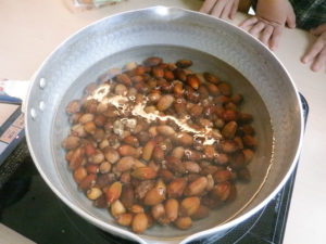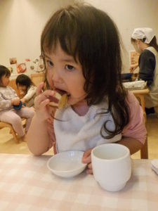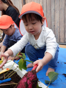 5月に植えたさつまいもを収穫しました。夏の暑い日も毎日みんなでお水をあげてお世話をしていたこともあり、たくさんのお芋が収穫でき、「オッキーネー」「ハヤクタベタイネ~」と大喜びの子どもたちでした。楽しみにしていたお芋はまず焼き芋にして食べてみることに。自分たちで育てたお芋は特別に美味しかったようで「オイシイ!」「モットチョウダイ」とたくさんの笑顔を見せてくれました。お芋が得意でないお友だちも“ちょっと食べてみようかな?”と食べてみようとする姿が見られ、自然と触れ合う中で成長過程を知り、実際に調理をして食べてみることで食への興味関心が育まれているように感じます。まだたくさんのお芋が残っている為、次は絵本でみたさつまいももちを作ってみる予定です。