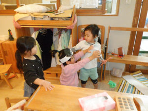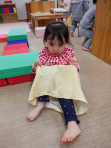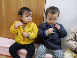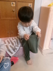 衣服や靴の着脱に興味を示すようになってきました。以前は人形の服を脱がせていましたが最近は着せてあげようとする様子も見られます。また遊びの中で、『お友だちにもしてあげたい』と言う気持ちが芽生えてきています。散歩時や排泄時には子どもたちそれぞれの『自分でしてみたい』と言う気持ちを受け止め見守るようにしています。脱ぐ時、首や足が抜けにくい時には、保育者がさり気なく援助し『自分で出来た』と達成感を味わえるようにしています。「上手にズボン履けたね」「自分で靴脱げたね」と嬉しい気持ちを日々積み重ねていく中で『また自分でやってみよう』という自信に繋げられるようにしていきたいと思います。