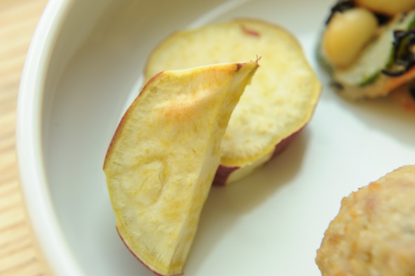 高野豆腐のハンバーグ さつま芋のグリル ひじきと大豆のサラダ チンゲンサイのスープ ☆おやつ ぶどうゼリー