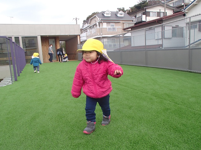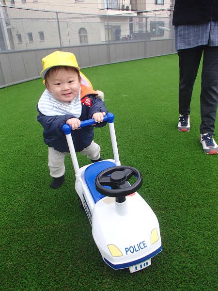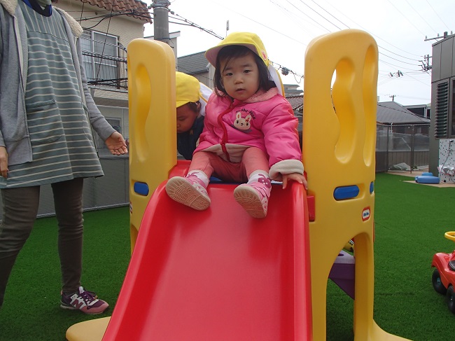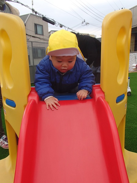 本園のテラスで遊びました。初めてのテラスでしたがすずらん組の友だちはとても楽しそうです。遊具に興味を持ち、保育者に支えてもらいながら滑り台を滑ったり押し車を押したりと、とてもいい表情で遊んでいます。