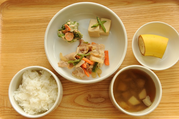 豚肉のしょうが焼き 高野豆腐の含煮 しろなのゴママヨ和え 吉野汁 ☆おやつ かぼちゃドーナツ