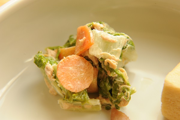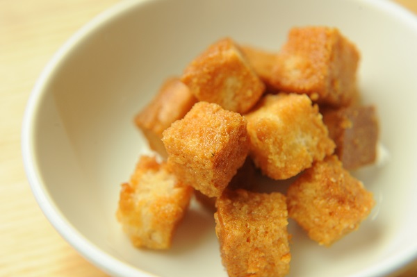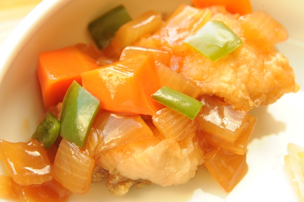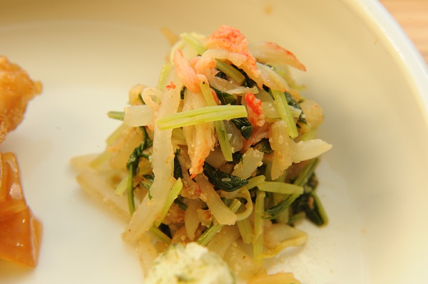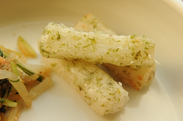 鶏肉の甘酢炒め 長芋の磯辺揚げ 水菜とかにかまのナムル 冬瓜と卵のスープ ☆おやつ サイコロラスク