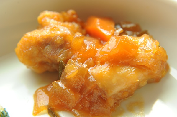 鶏肉の甘酢炒め 焼きかぼちゃ 水菜とかにかまのナムル 冬瓜と卵のスープ ☆おやつ 大豆かりんとう