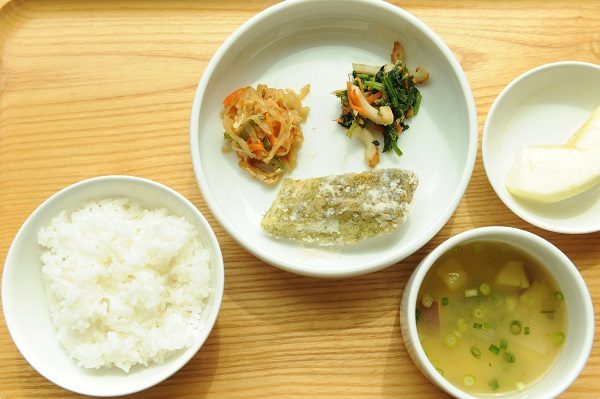 さわらの塩焼き 豚肉とかぼちゃの煮物 青菜とひじきのゴマ和え 焼ふと卵のみそ汁
