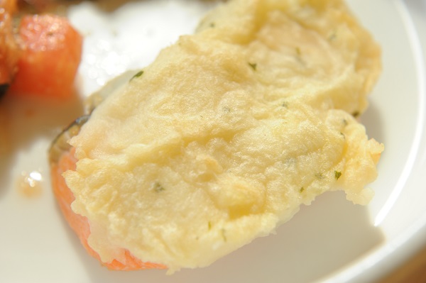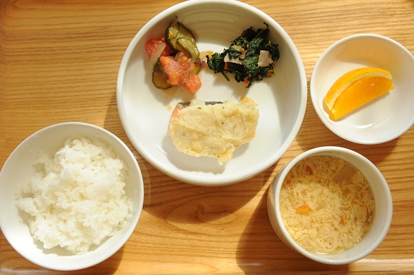 鮭のポテマヨ焼き ほうれん草のソテー 海藻サラダ 卵のコンソメスープ ☆おやつ 人参パウンドケーキ