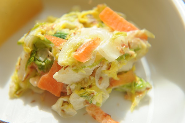 鮭のつけ焼き 大根と厚揚げの煮物 白菜のおかかマヨ和え もずくのすまし汁