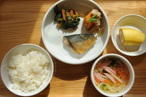 さばのみそ煮 豚肉とかぼちゃの煮物 ほうれん草のなめたけおろし和え そうめん汁 ☆おやつ 卵サンド