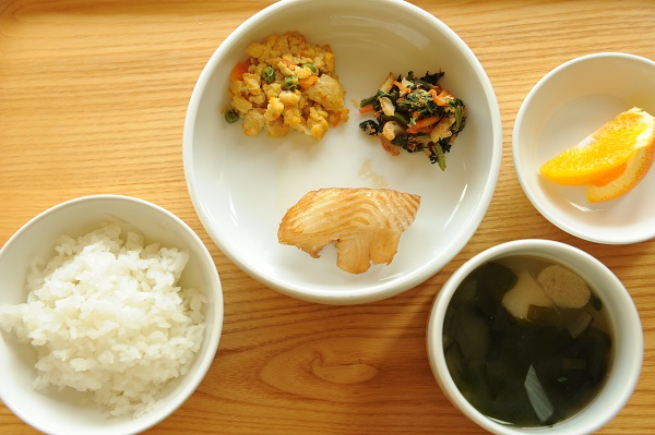 さわらの塩焼き 豚肉とかぼちゃの煮物 小松菜とツナの和え物 大根のみそ汁 ☆おやつ 卵サンド