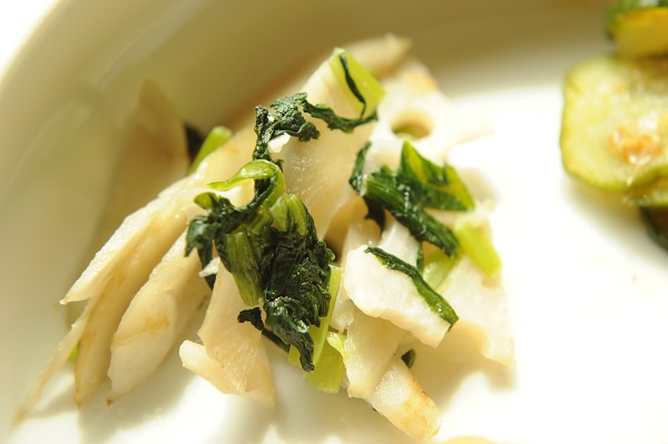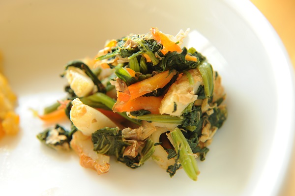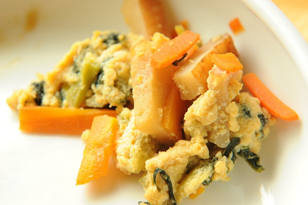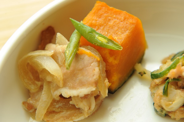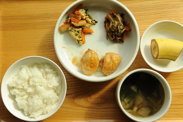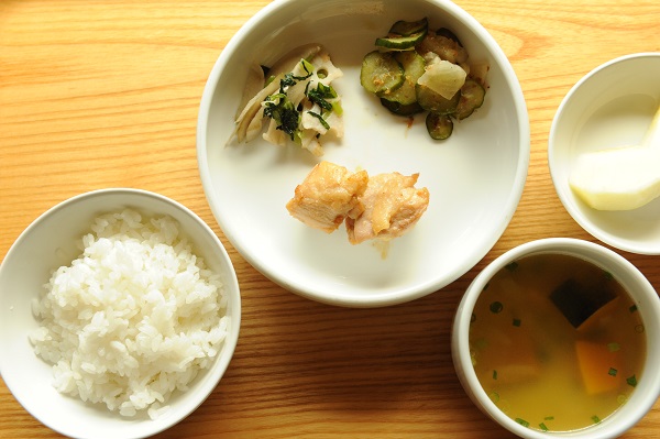 鶏肉のうま辛焼き 根菜と小松菜の塩炒め きゅうりと大根のおかか和え かぼちゃのみそ汁 ☆おやつ 恐竜の卵クッキー