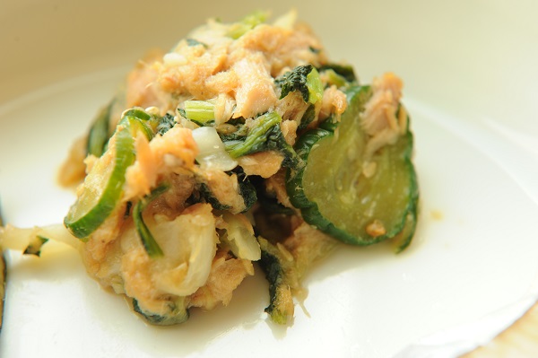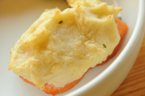 鮭のポテマヨ焼き ズッキーニのチーズフリット オクラとトマトのサラダ 卵のコンソメスープ