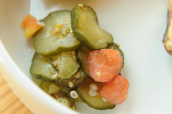 さばの甘酢からめ ズッキーニのみそ炒め きゅうりとトマトのゴマ和え えのきのすまし汁 ☆おやつ 幼児:わらび餅 乳児:りんごゼリー