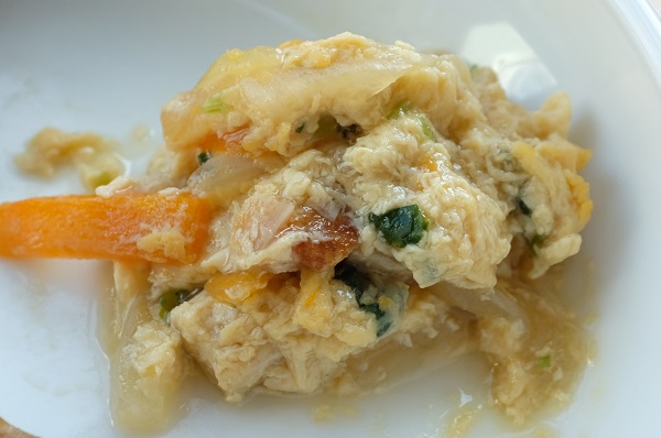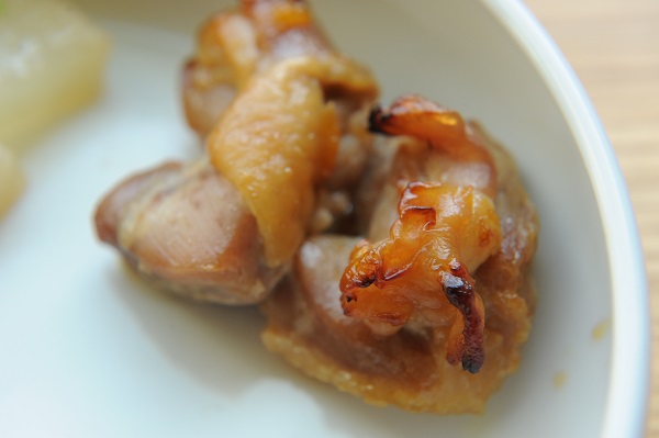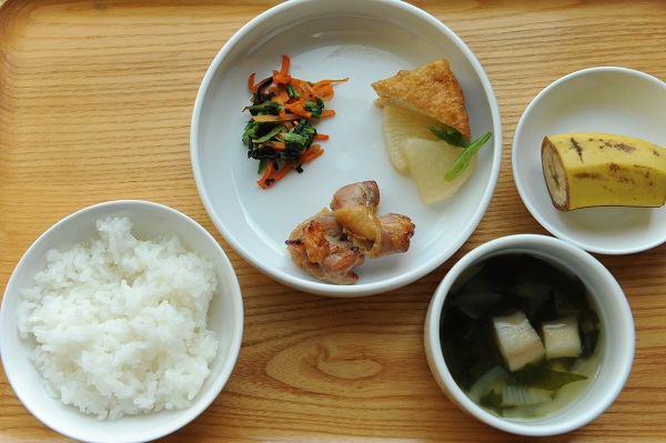 鶏のあんずしょうゆ焼き 大根と厚揚げの煮物 小松菜の塩昆布和え 麩とわかめのすまし汁 ☆おやつ 焼き芋